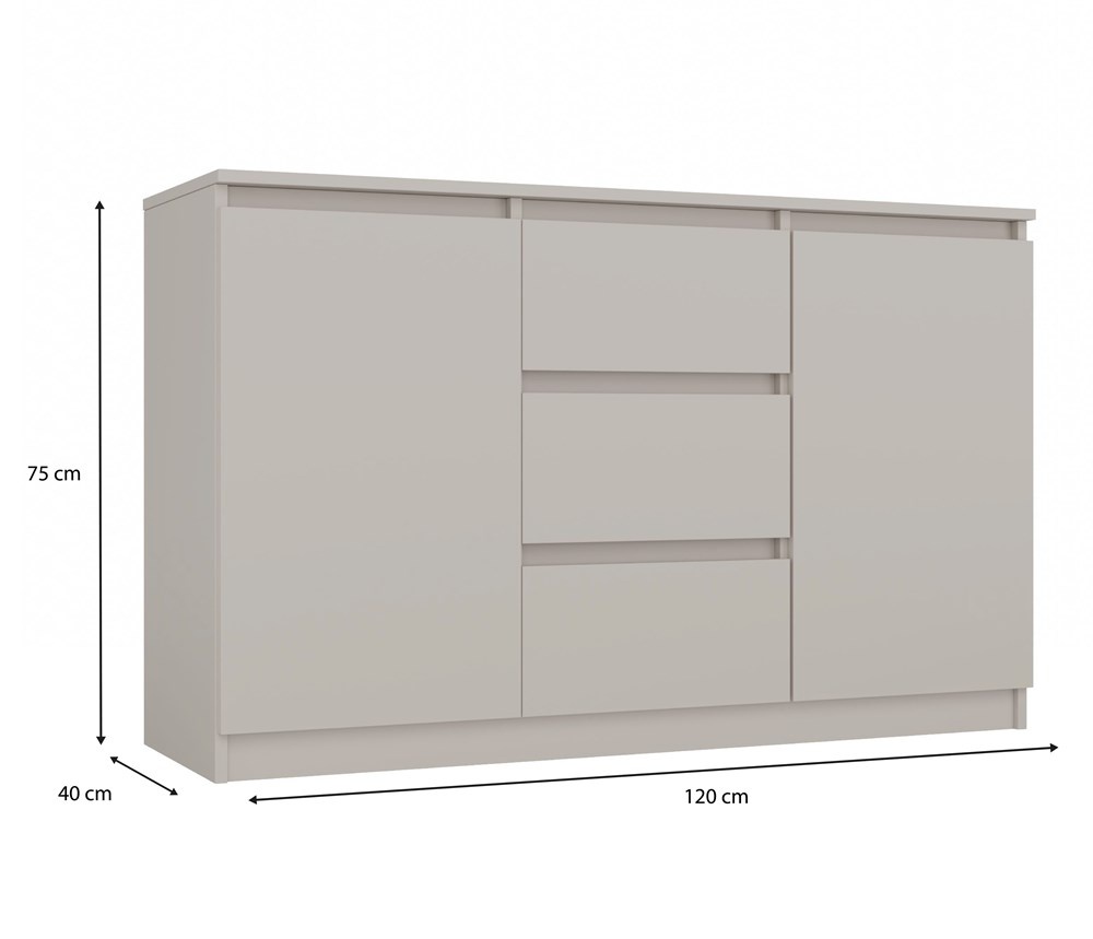 Dit dressoir is een echte must have voor elke woonkamer. Het dressoir is gemaakt van gelamineerde spaanplaat en heeft mooie afgewerkte randen met PVC. De laden zijn op rolgeleiders geplaatst, waardoor het gebruik ervan comfortabel en veilig is. Het dressoir is 120 cm breed, 38 cm diep en 75 cm hoog.