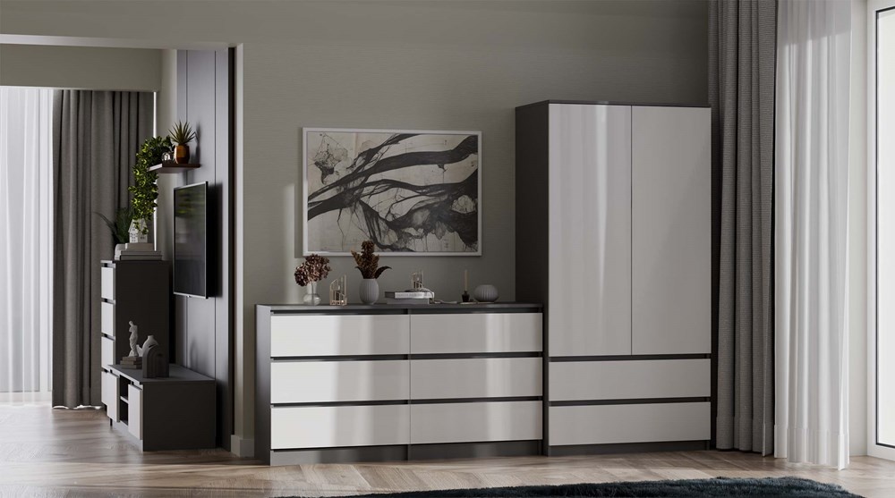 Met TIP-ON kastdeursysteem - opent wanneer de voorkant voorzichtig wordt ingedrukt. Mogelijkheid om planken aan de linker- of rechterkant te monteren.
