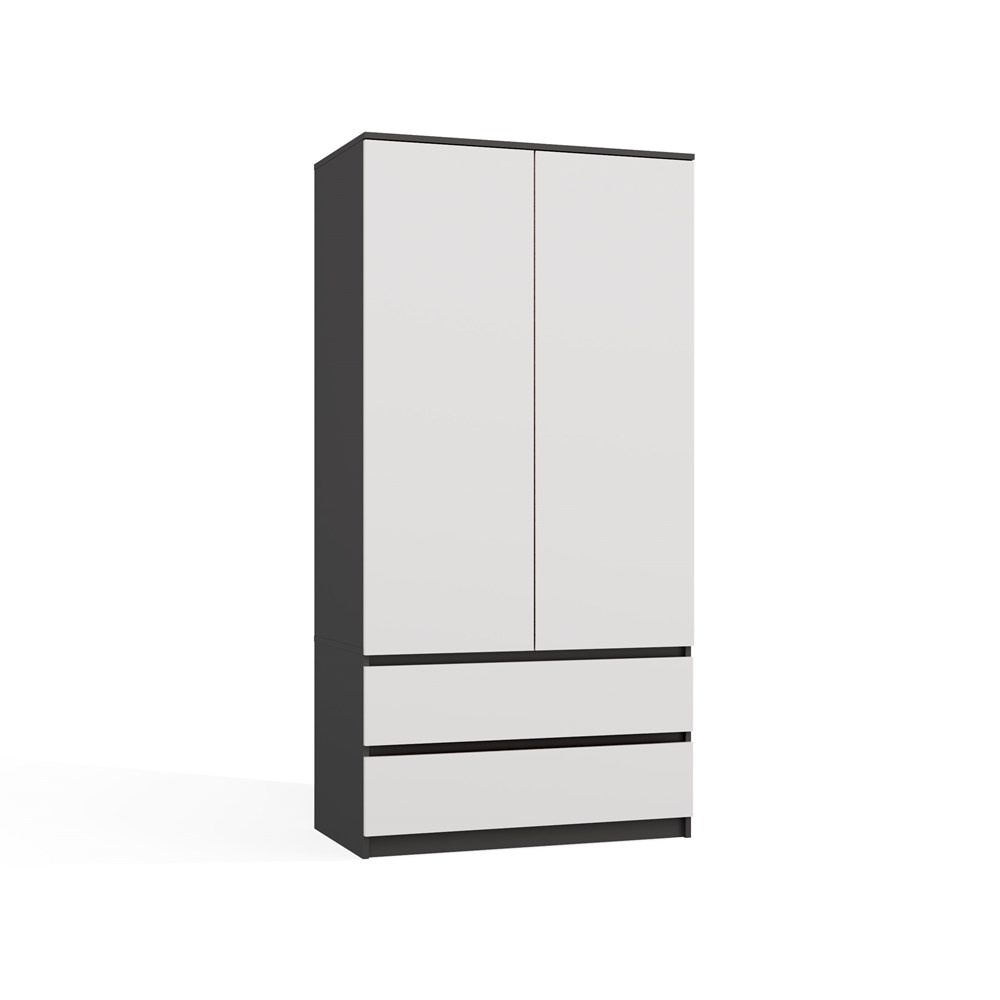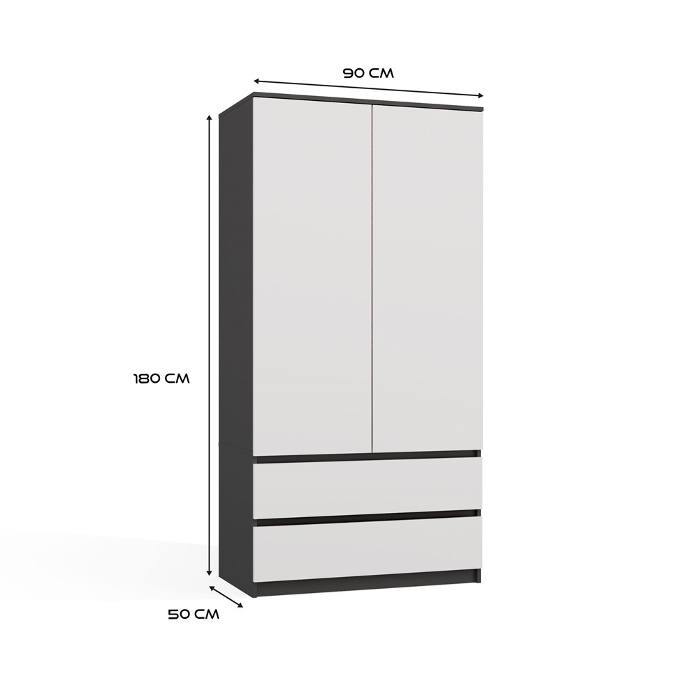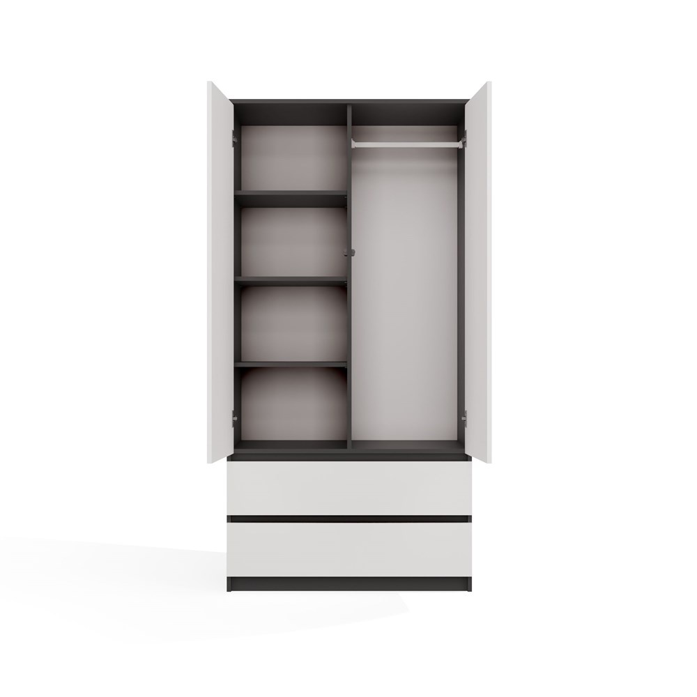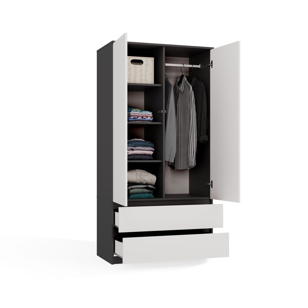 Aan de rechterzijde vind je een roede / stang om kleding op te hangen. Aan de linkerkant vind je in totaal 4 vakken om kleding in op te bergen. Aan de onderkant van de kledingkast bevinden zich 2 lades.